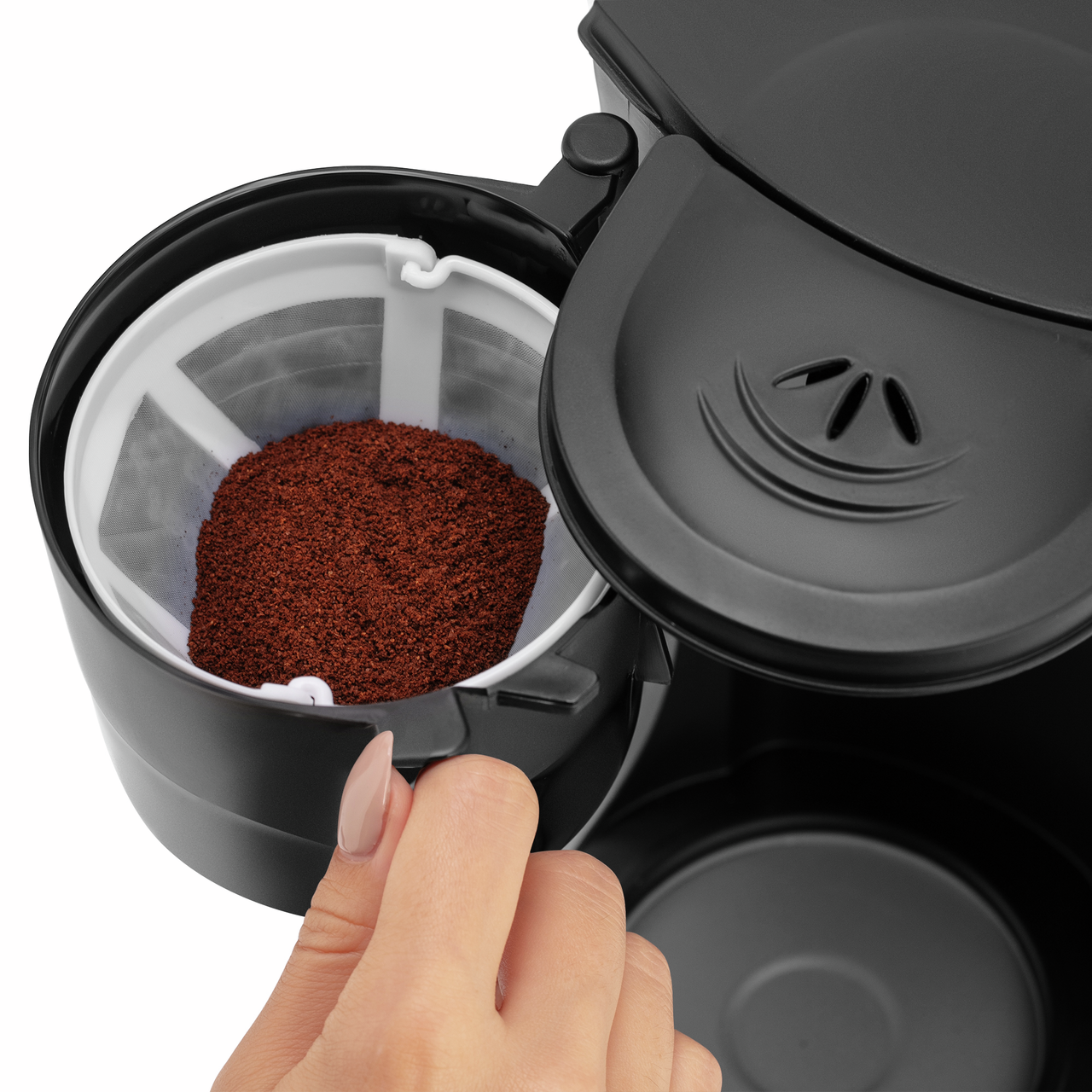 Кофеварка Maxwell 1650 съемный нейлоновый фильтр шкала уровня воды противокапельная система 600 мл, 16,5 х 26,5 х 21,5 см — компактное устройство, которое легко поместится на столе в кухне или в небольшом офисе. Она снабжена стеклянным кувшином, позволяющим готовить до 5-6 чашек напитка за один раз. Устройство оснащено функцией автоподогрева и способно поддерживать постоянную температуру кофе в емкости, сохраняя его насыщенный вкус и приятный аромат. Отличительной особенностью изделия является то, что пользователь может доставать кувшин, не дожидаясь окончания заваривания. Специальный клапан перекроет подачу жидкости, предотвратив ее протекание на подставку. Система заваривания осуществляется путем прохождения кипятка через молотый кофе. Кофеварка оснащена съемным нейлоновым фильтром, колбой объемом 600 мл (на 4-6 чашек), шкалой уровня воды и переключателем Вкл. /Выкл. со световым индикатором работы.