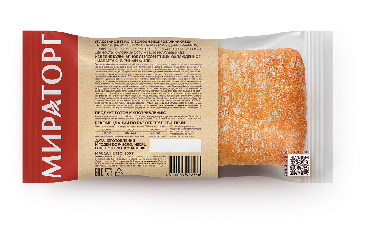 Чиабатта мука пшеничная хлебопекарная высшего сорта, вода питьевая, соль, масло подсолнечное рафинированное дезодорированное, комплексная пищевая добавка эмульгатор: эфиры глицерина и диацетилвинной и жирных кислот, антиокислитель: аскорбиновая кислота, ферментный препарат микробного происхождения, дрожжевые культуры; курица отварная филе куриной грудки, соль, паприка, перец красный острый, чеснок, итальянские травы орегано, базилик, майоран, розмарин, чабер, тимьян, шалфей; соус майонез 67% масло подсолнечное рафинированное, вода питьевая, загуститель крахмал модифицированный, яичный желток, стабилизатор ксантановая камедь, сахар, соль поваренная, регулятор кислотности: лимонная кислота , уксусная кислота; краситель бета-каротин, горчица пищевая вода питьевая, горчичный порошок, масло подсолнечное рафинированное, соль, регулятор кислотности: уксусная кислота, перец черный горошек, гвоздика, лавровый лист, соус Ворчестер уксус солодовый, уксус спиртовой, патока, сахар, соль, филе анчоусов, экстракт тамаринда, лук, чеснок, соус соевый соевые бобы, вода питьевая, соль, сахар, стабилизатор: декстрин, сельдь слабосоленая сельдь тихоокеанская, масло подсолнечное рафинированное, соль, лимонная приправа вода питьевая, сок лимонный концентрированный, регулятор кислотности: лимонная кислота, соль, уксус винный, чеснок, соус табаско спиртовой уксус, перец хабанеро, сахар тростниковый, перечный соус Табаско, соль, пюре манго, лук сушеный, банановое пюре, томатная паста, пюре томаринда, пюре папайи, чеснок, перечная масса Табаско красный перец, соль, перец черный горошек; огурцы маринованные огурцы, вода питьевая, уксус, сахар, соль пищевая, перец черный горошек.