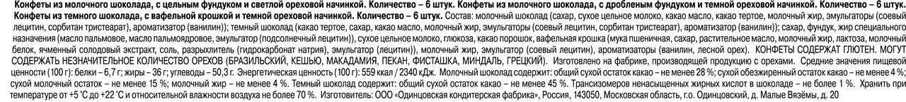 Молочный шоколад сахар, сухое цельное молоко, какао масло, какао тертое, молочный жир, эмульгаторы соевый лецитин, сорбитан тристеарат, ароматизатор ванилин; темный шоколад какао тертое, сахар, какао масло, молочный жир, эмульгаторы соевый лецитин, сорбитан тристеарат, ароматизатор ванилин; сахар, фундук, жир специального назначения масло пальмовое, масло пальмоядровое, эмульгатор подсолнечный лецитин, сухое цельное молоко, глюкоза, какао порошок, вафельная крошка мука пшеничная, сахар, растительное масло, молочный жир, лактоза, молочный белок, ячменный солодовый экстракт, соль, разрыхлитель гидрокарбонат натрия, эмульгатор лецитин, молочный жир, эмульгатор соевый лецитин, ароматизаторы ванилин, лесной орех. КОНФЕТЫ СОДЕРЖАТ ГЛЮТЕН. МОГУТ СОДЕРЖАТЬ НЕЗНАЧИТЕЛЬНОЕ КОЛИЧЕСТВО ОРЕХОВ БРАЗИЛЬСКИЙ, КЕШЬЮ, МАКАДАМИЯ, ПЕКАН, ФИСТАШКА, МИНДАЛЬ, ГРЕЦКИЙ.
