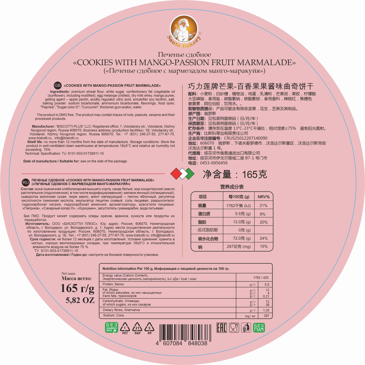 Печенье Santa Bakery сдобное мармелад манго и маракуйя, 165г