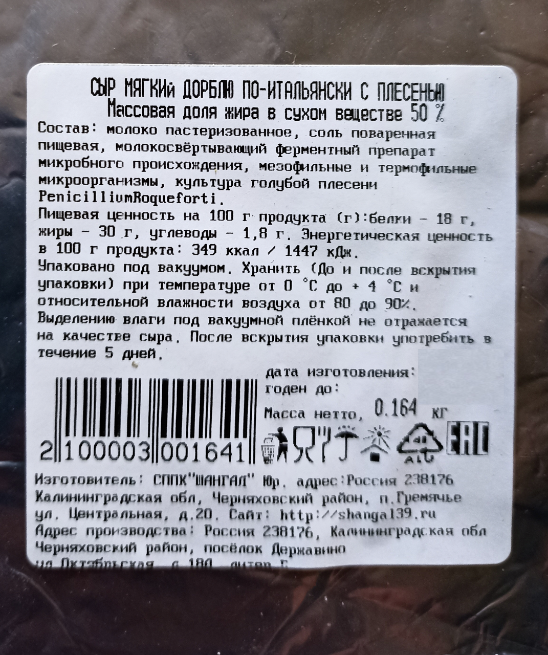 Молоко пастеризованное, соль поваренная пищевая, молокосвертывающий ферментный препарат микробного происхождения, мезофильные и термофильные микроорганизмы, культура голубой плесени Penicillium Roqueforti.