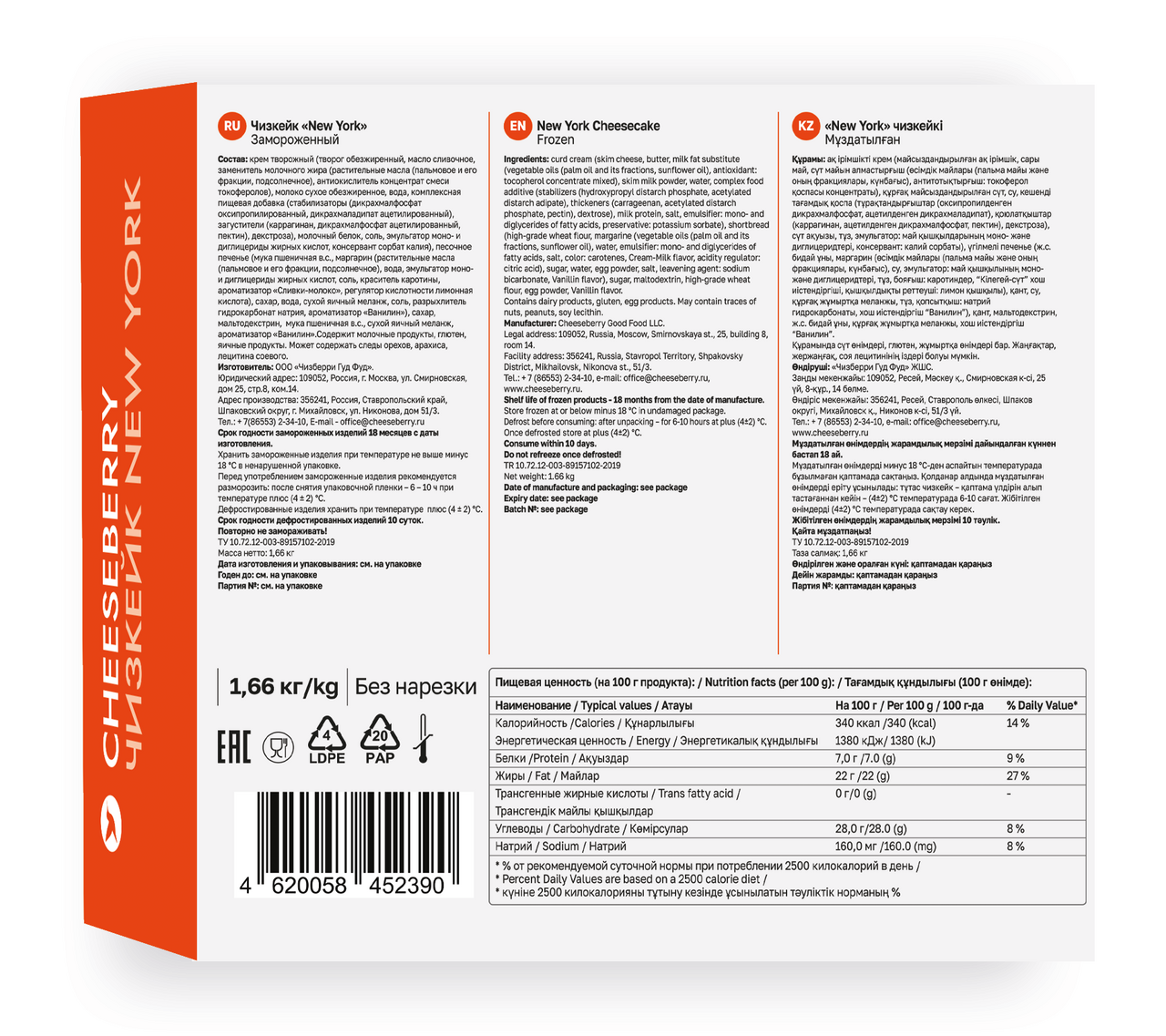 Чизкейк Cheeseberry New York классический замороженный 16 порций, 1.66кг