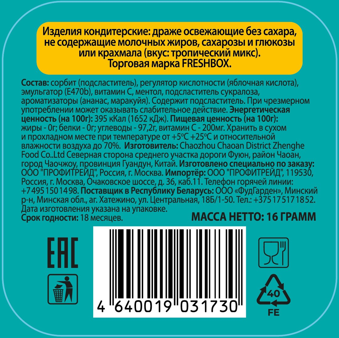 Драже FreshBox Тропический микс без сахара, 16г