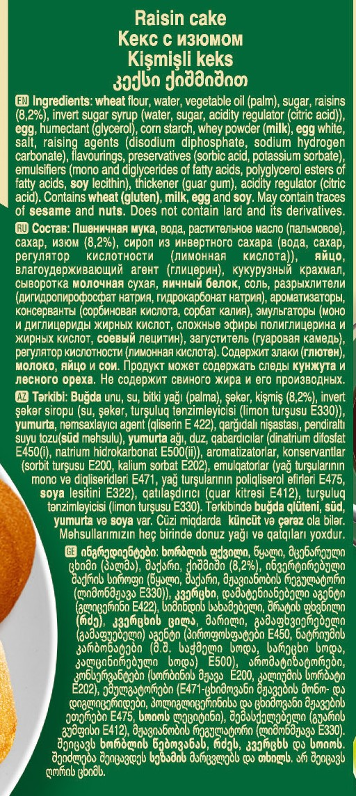 Пшеничная мука, вода, растительное масло пальмовое, сахар, изюм, сироп из инвертного сахара вода, сахар, регулятор кислотности лимонная кислота, яйцо, влагоудерживающий агент глицерин, кукурузный крахмал, сыворотка молочная сухая, яичный белок, соль, разрыхлители дигидропирофосфат натрия, гидрокарбонат натрия, ароматизаторы, консерванты сорбиновая кислота, сорбат калия, эмульгаторы моно и диглицериды жирных кислот, сложные эфиры полиглицерина и жирных кислот, соевый лецитин, загуститель гуаровая камедь, регулятор кислотности лимонная кислота.