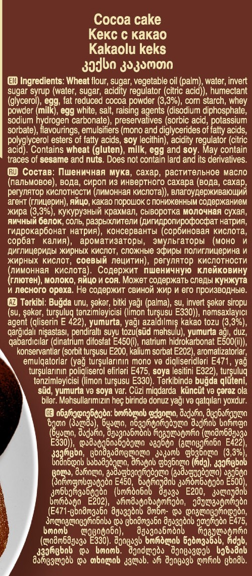 Пшеничная мука, сахар, растительное масло пальмовое, вода, сироп из инвертного сахара вода, сахар, регулятор кислотности лимонная кислота, влагоудерживающий агент глицерин, яйцо, какао порошок с пониженным содержанием жира, кукурузный крахмал, сыворотка молочная сухая, яичный белок, соль, разрыхлители дигидрокарбонат натрия, гидрокарбонат натрия, консерванты сорбиновая кислота, сорбит калия, ароматизаторы, эмульгаторы моно и диглицериды жирных кислот, сложные эфиры полиглицерина и жирных кислот, соевый лецитин, регулятор кислотности лимонная кислота.