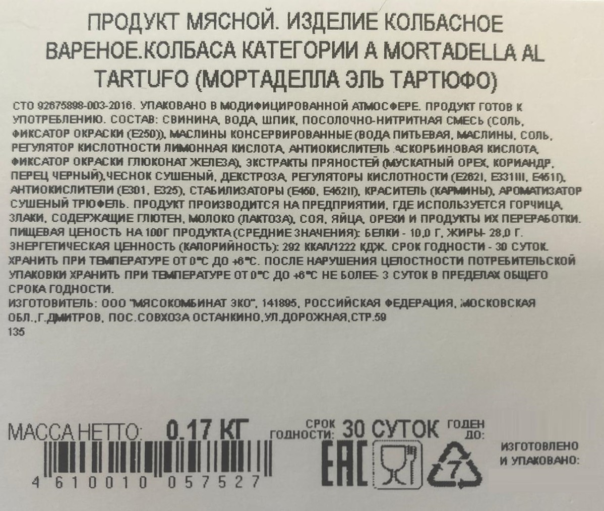 Свинина, вода, шпик, посолочно-нитритная смесь (соль, фиксатор окраски (е250)), маслины консервированные (вода питьевая, маслины, соль, регулятор кислотности лимонная кислота, антиокислитель аскорбиновая кислота, фиксатор окраски глюконат железа), экстракты пряностей (мускатный орех, кориандр, перец черный), чеснок сушеный, декстроза, регуляторы кислотности (е262i, е331iii), антиокислители (е301), краситель (кармины), сушеный трюфель, ароматизатор сушеный трюфель.