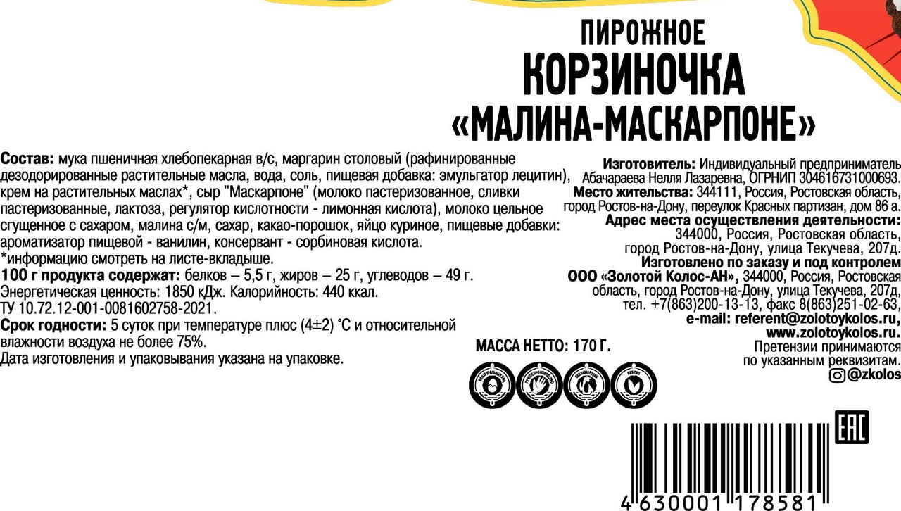 Корзиночка Золотой колос с малиной и маскарпоне 2шт, 170г
