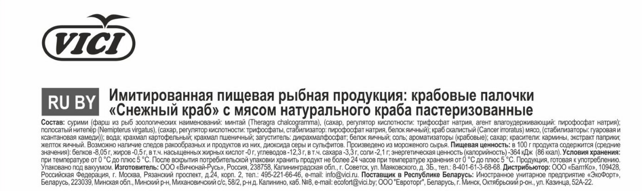 Сурими (фарш рыбный из зоологического вида рыбы (красный нитепер ( Nemipterus japonicus)), влагоудерживающий агент: полифосфаты); мясо скалистого краба (Cancer irroratus); вода; загуститель: дикрахмалфосфат; крахмал пшеничный; масло растительное; соль; сахар; белок яичный; ароматизаторы; экстракт дрожжей; белок пшеничный ферментированный; красители: кармины, экстракт паприки; желток яичный.