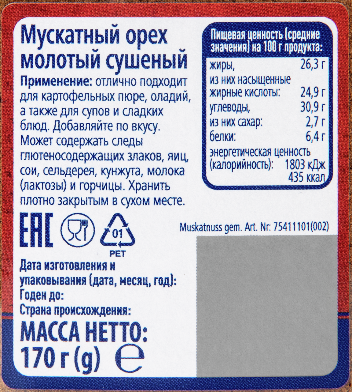 https://vk.com/video-57037704_456241714?list=ln-L8fvDaUBqhxYtLNZK5 Это специя, полученная из семян определенного вида плодового дерева, известного как мускатное дерево. Его нежный вкус и аромат делают его популярным в кулинарии по всему миру. Мускатный орех молотый - это неотъемлемая часть многих кулинарных шедевров. Его уникальный аромат способен преобразить даже самое скромное блюдо. Применение: отлично подходит для картофельных пюре, оладий, а также для супов и сладких блюд. Добавляйте по вкусу.