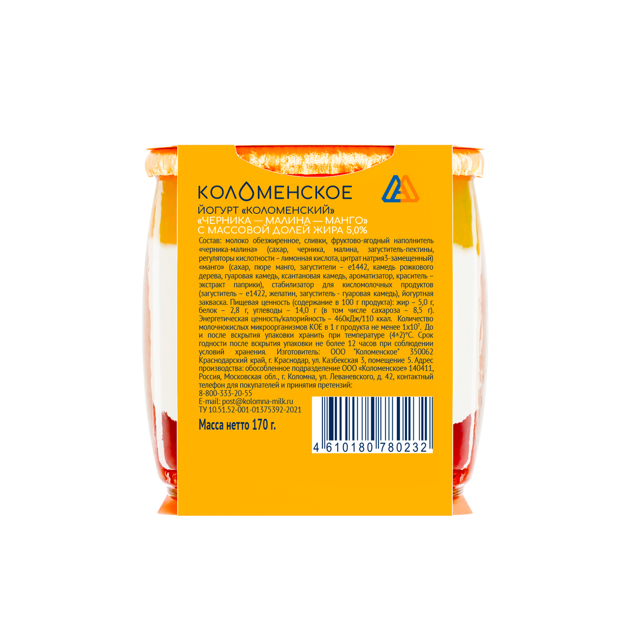Йогурт Коломенский приготовлен из молока, упакован в удобную стеклянную баночку. Верхний и нижний слои - фруктово-ягодные наполнители (черника-малина-манго), средний слой - нежнейший йогурт. Можно употребить не перемешивая или перемешать слои для получения однородной массы. Все прозрачно: натуральность, многослойность и качество.