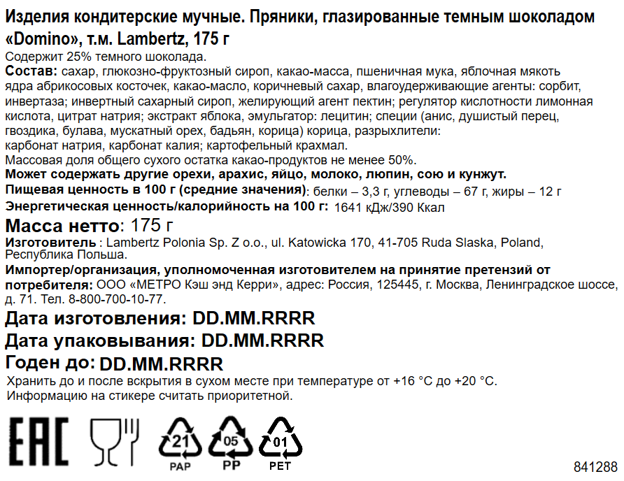 Пряники Lambertz Domino глазированные темным шоколадом с яблочным желе и персипаном, 175г