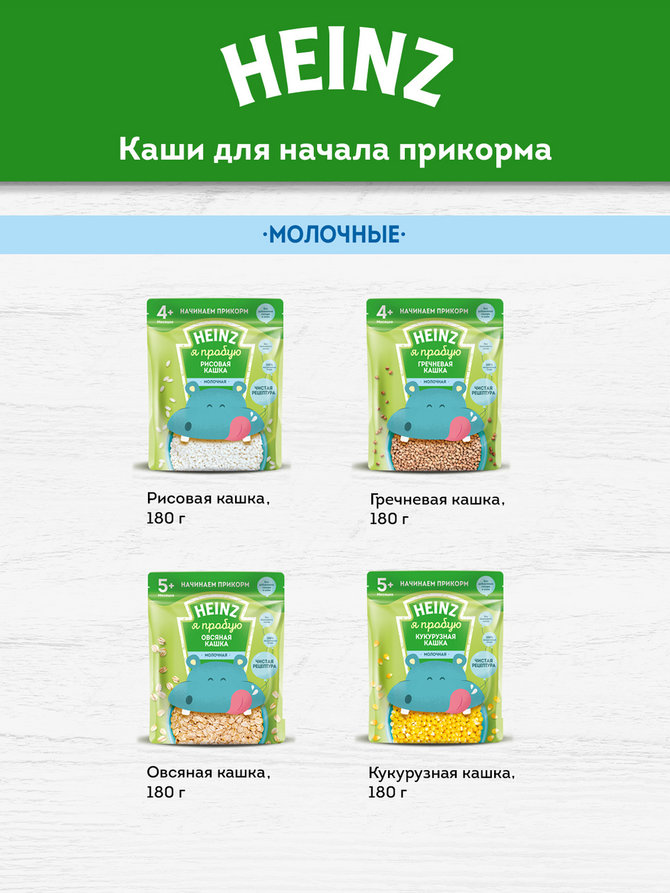 Безмолочные злаковые каши созданы для прикорма малышей с 6 месяцев. Продукция объединяет полезные свойств трех зерновых культур, позволяет разнообразить рацион ребенка и познакомить его с новыми вкусами. Кукуруза богата клетчаткой, необходимой для нормального пищеварения. Пшеница содержит калий, фосфор и кальций для полноценного развития. Овес положительно влияет на желудочно-кишечный тракт и поддерживает нормальный обмен веществ.