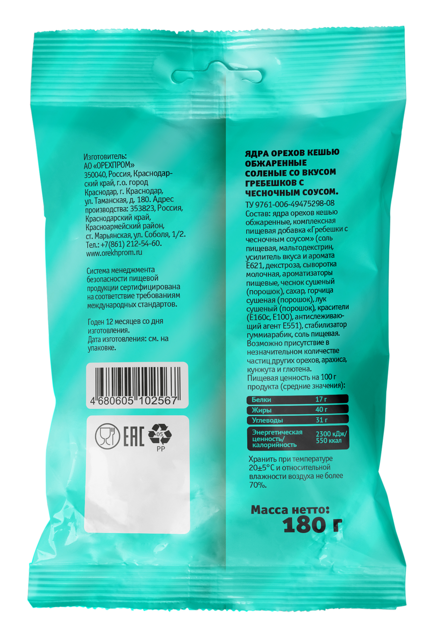 Ядра орехов кешью обжаренные, комплексная пищевая добавка Гребешки в чесночном соусе мальтодекстрин, соль пищевая, декстроза, усилитель вкуса и аромата Е621, ароматизаторы пищевые, антислеживающий агент Е551, краситель Е160с, стабилизатор гуммиарабик, соль пищевая, горчица сушёная, чеснок сушёный.