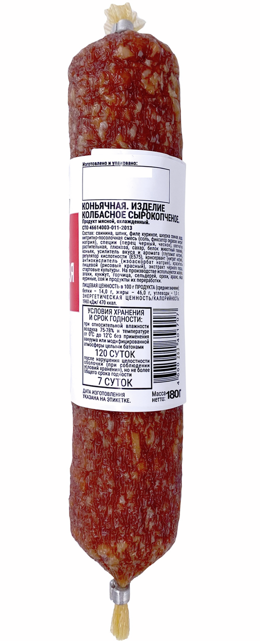 Свинина, шпик, филе куриное, шкурка свиная, вода, нитритно-посолочная смесь соль, фиксатор окраски: нитрит натрия, специи перец чёрный, чеснок, клетчатка растительная, глюкоза, сахар, белок животный говяжий, коньяк, усилитель вкуса и аромата глутамат натрия, регулятор кислотности Е575, консервант нитрат натрия, антиокислитель изоаскорбат натрия, краситель пищевой рисовый красный, экстракт чёрного перца, стартовые культуры.