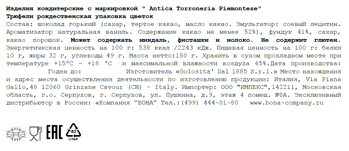 Рождество: уникальный праздник, который ждут круглый год с радостью, эмоциями и... сладость! Antica Torroneria Piemontese, также в этом году, не застигнута врасплох, создав совершенно новую упаковку под названием Рождественский цветок. Наши вкусные сладкие трюфели, originals, также в рождественском обличии, отмечают самый важный праздник в году наилучшим образом. Вкус лакомства нежный, приятный, с горьковатыми нотками шоколада и фундука.