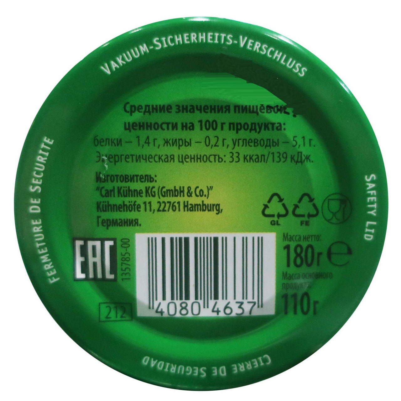 Корнишоны, вода, спиртовой уксус, сироп глюкозно-фруктозный глюкоза, фруктоза, укроп, лук, семена горчицы, соль, сахар, натуральный ароматизатор: маринованные огурцы.