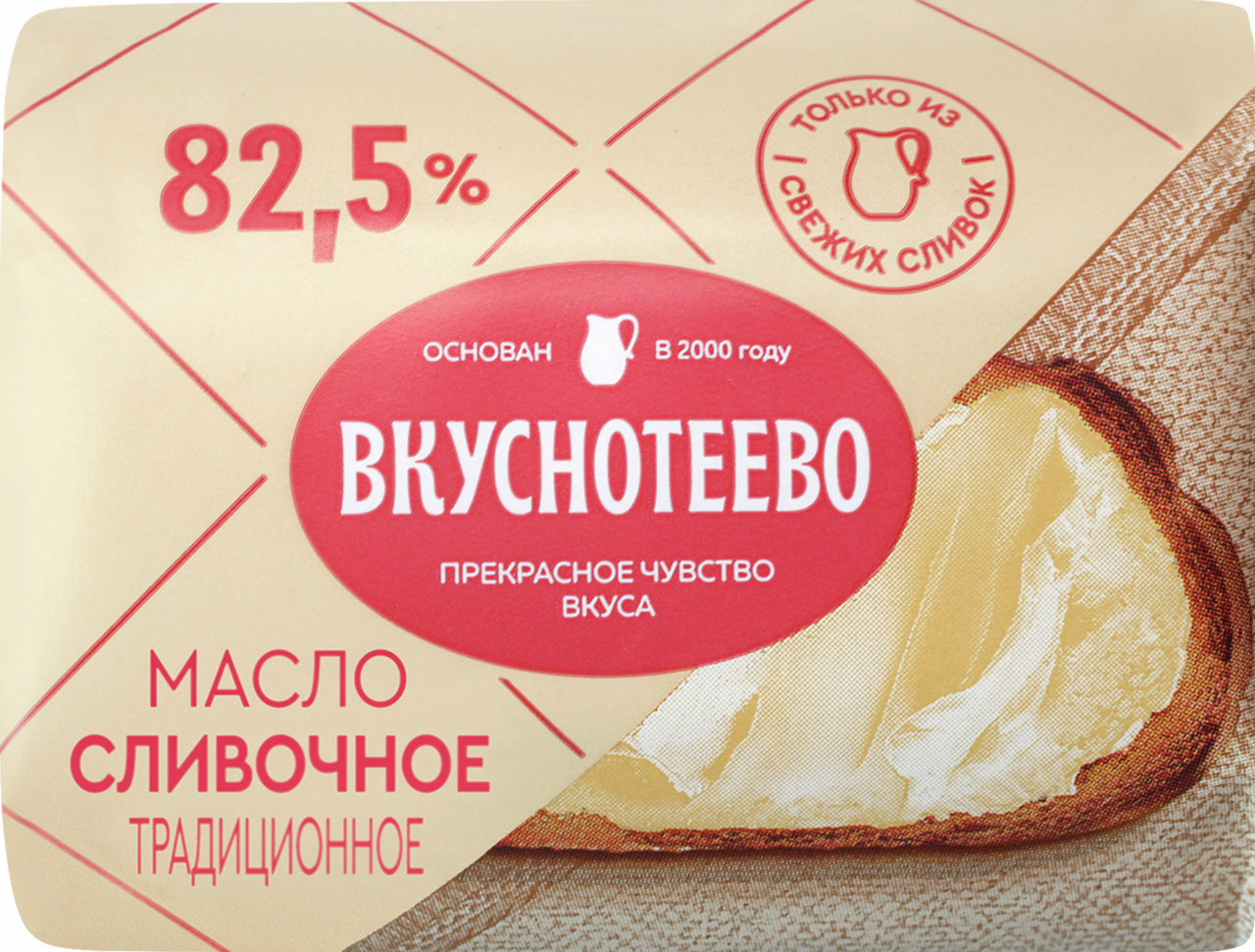 Масло Вкуснотеево изготовлено поособой технологии- способом холодного сбивания. При таком способе производства сливки ненагреваются и, соответственно, неразрушаются белковые связи. Таким образом, всливочном масле сохраняется чистый, насыщенный вкус натуральных сливок. На1кгмасла Вкуснотеево приходится 25 литров молока высшего сорта. Особая форма буханки удобна вприготовлении бутербродов, атакже позволяет воплотить больше идей при сервировке вкулинарии. Специальный материал упаковки- линкавер- позволяет увеличить срок хранения продукта вдове, до60 суток. Изготовлено по особой технологии - способом холодного сбивания. Благодаря такому способу сливки не нагреваются и в них не разрушаются белковые связи. Так в масле сохраняется чистый, насыщенный вкус натуральных сливок. Для изготовления 1кг масла используется 25л молока высшего сорта. Особая форма буханки удобна в приготовлении бутербродов и позволяет воплотить больше идей при сервировке. Торты, пирожки, печенье, круассаны, кексы - вы сможете воплотить в жизнь все кулинарные замыслы.