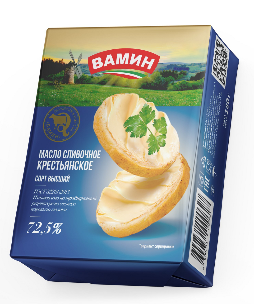 Масло сливочное Вамин Крестьянское ГОСТ 72.5%, 180г