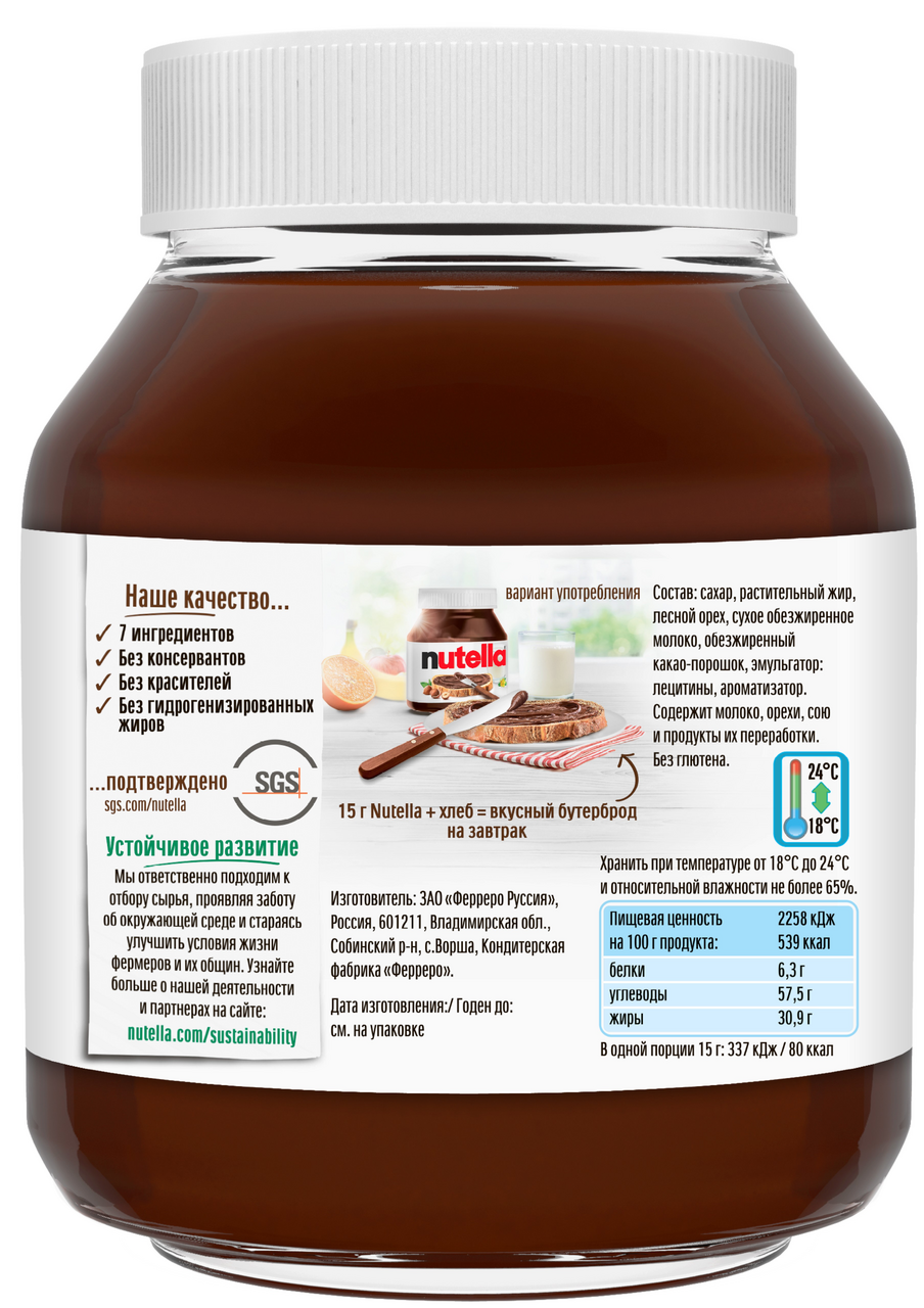 Благодаря уникальному рецепту ореховая паста Нутелла обладает неповторимым вкусом и кремовой текстурой. В состав Нутелла входит 7 тщательно отобранных ингредиентов, а при ее производстве не используются консерванты и красители. Нутелла станет неотъемлемой частью вашего завтрака, а также отличным ингредиентом для торта, бисквитов, капкейков, шоколадного крема и других кондитерских изделий и десертов.