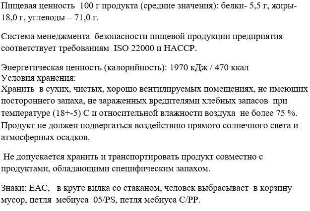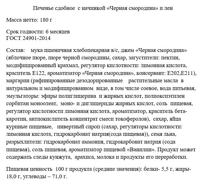 Мука пшеничная хлебопекарная высшего сорта, джем Чёрная смородина (яблочное пюре, пюре чёрной смородины, сахар, загустители: пектин, модифицированный крахмал, регулятор кислотности: лимонная кислота, краситель Е122, ароматизатор Чёрная смородина, консервант: Е202,Е211), маргарин (рафинированные дезодорированные растительные масла в натуральном и модифицированном виде, в том числе соевое, вода питьевая, эмульгаторы: эфиры полиглицерина и жирных кислот, полиоксиэтилен сорбитан моноолеат, моно - и диглицериды жирных кислот, соль пищевая, регулятор кислотности лимонная кислота, ароматизатор, краситель бета-каротин, антиокислитель концентрат смеси токоферолов), сахар, яйца куриные пищевые, инвертный сироп (сахар, регуляторы кислотности: лимонная кислота, гидрокарбонат натрия (сода пищевая)), семя льна, разрыхлители: гидрокарбонат аммония, гидрокарбонат натрия (сода пищевая), соль пищевая, ароматизатор пищевой Ванилин.