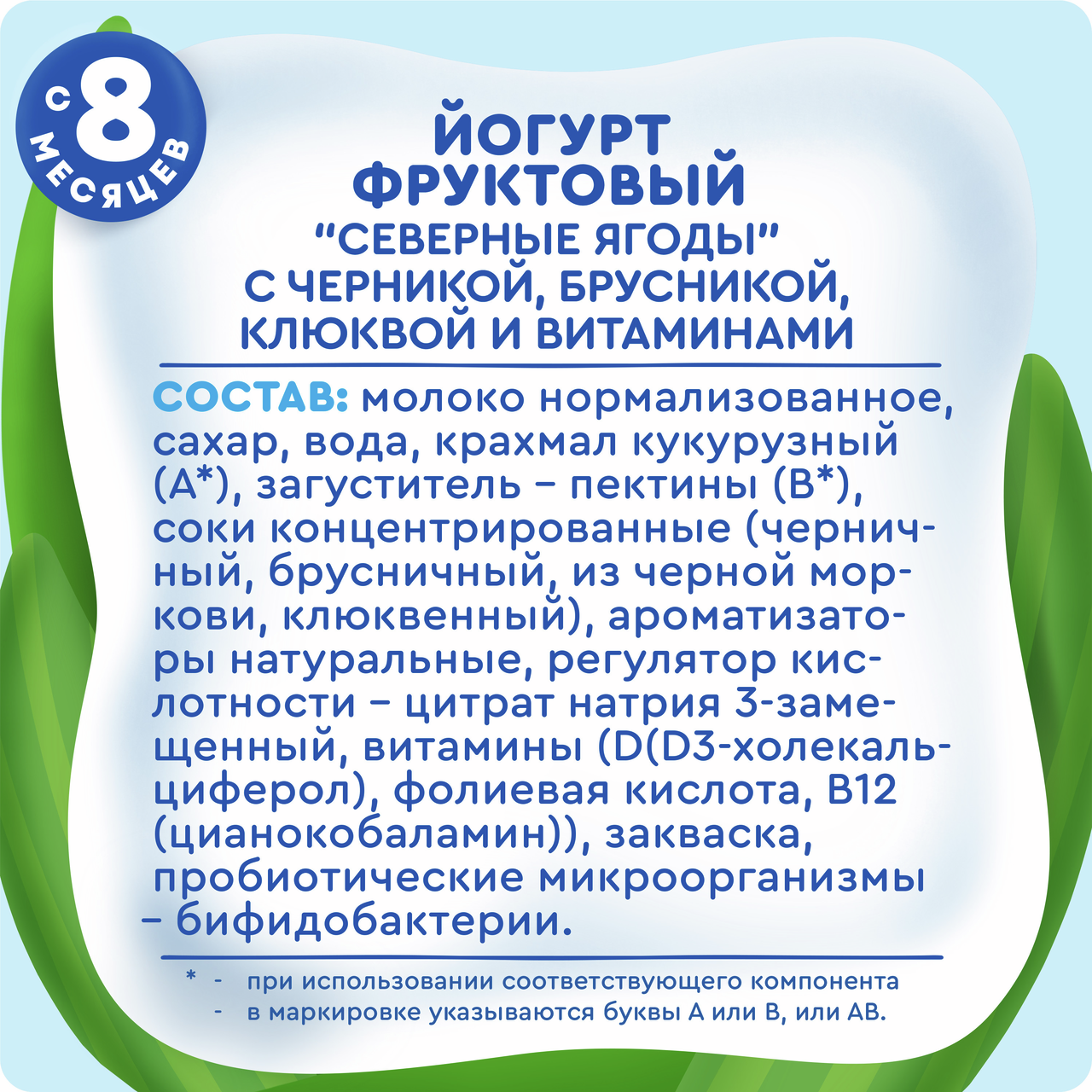 Mолоко нормализованное, фруктовый наполнитель Северные ягоды сахар, вода, крахмал кукурузный, соки концентрированные черничный, брусничный, из черной моркови, клюквенный, ароматизаторы натуральные Брусника, Черника, загуститель – пектины, витаминный премикс D D3-холекальциферол, фолиевая кислота, В12 цианокобаламин, регулятор кислотности – цитрат натрия 3-замещенный, пребиотик - олигофруктоза, концентрат сывороточных белков, закваска, пробиотические микроорганизмы – бифидобактерии ВВ12.