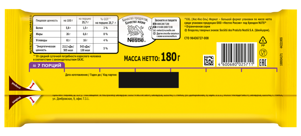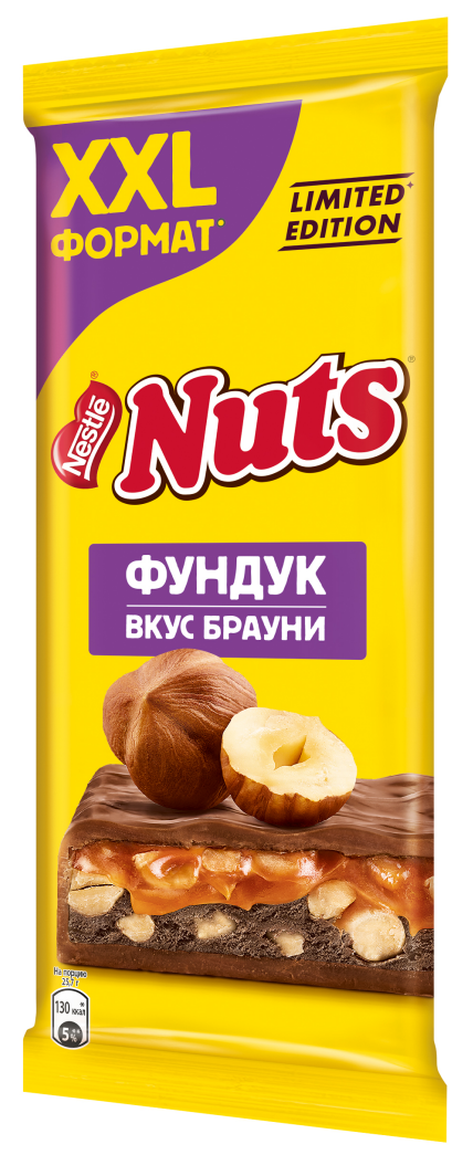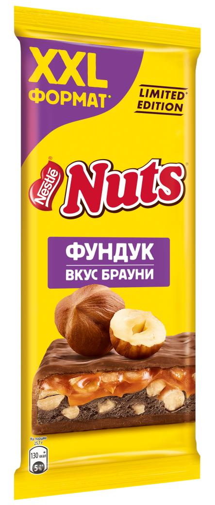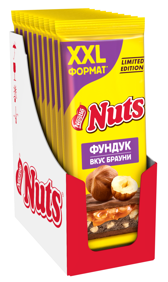Новое прочтение вкуса шоколадного батончика Nuts - теперь в виде шоколадной плиты ХXL Формата. Ограниченная серия шоколадной плиты Nuts со вкусом Брауни - это молочный шоколад, обжаренный дробленый фундук, тягучая мягкая карамель и нежная шоколадная нуга со вкусом Брауни. Nuts всегда радует своим крутым вкусом и помогает подзарядить мозги, ведь фундук ценится за большое содержание магния и кальция, стимулирующих мозговую активность. Nuts отлично подходит в качестве быстрого перекуса между приемами пищи для себя или чтобы поделиться в компании друзей.