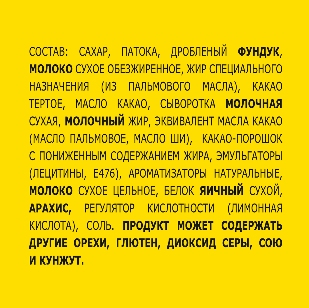 Сахар, патока, дробленый фундук, молоко сухое обезжиренное, жир специального назначения (из пальмового масла), какао тертое, масло какао, сыворотка молочная сухая, молочный жир, эквивалент масла какао (масло пальмовое, масло ши), какао-порошок с пониженным содержанием жира, эмульгаторы (лецитины, Е476), ароматизаторы натуральные, молоко сухое цельное, белок яичный сухой, арахис, регулятор кислотности (лимонная кислота), соль.