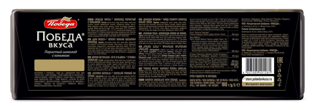 Шоколад Победа вкуса молочный пористый с коньяком, 180г