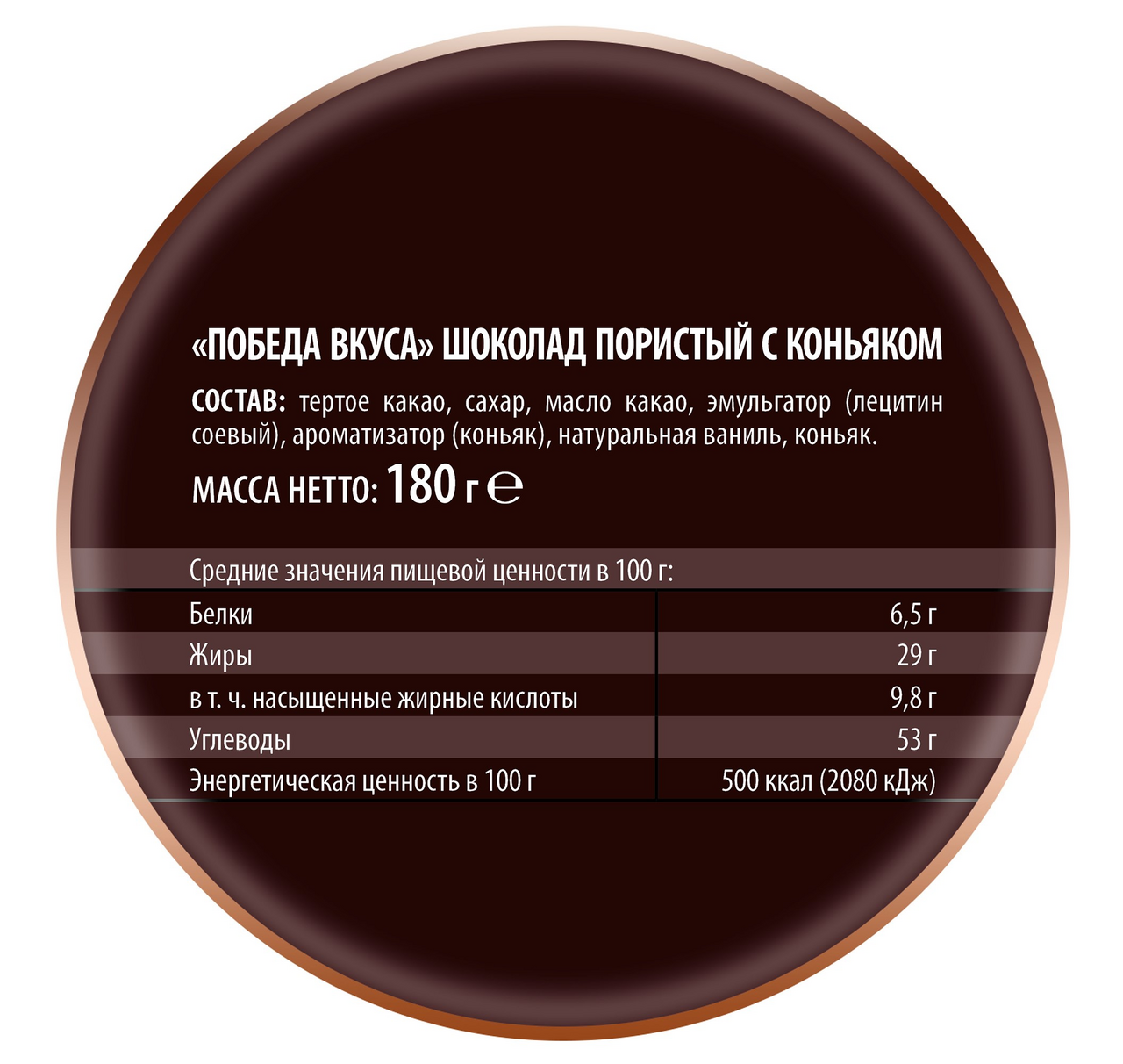 Десертный шоколад Победа отличается повышенным содержанием какао-бобов особой мягкой обжарки (50%). Благодаря пористой структуре этот шоколад просто тает во рту, а его насыщенный и глубокий вкусвеликолепно сочетается с классической для шоколада добавкой - согревающей ноткой коньяка.