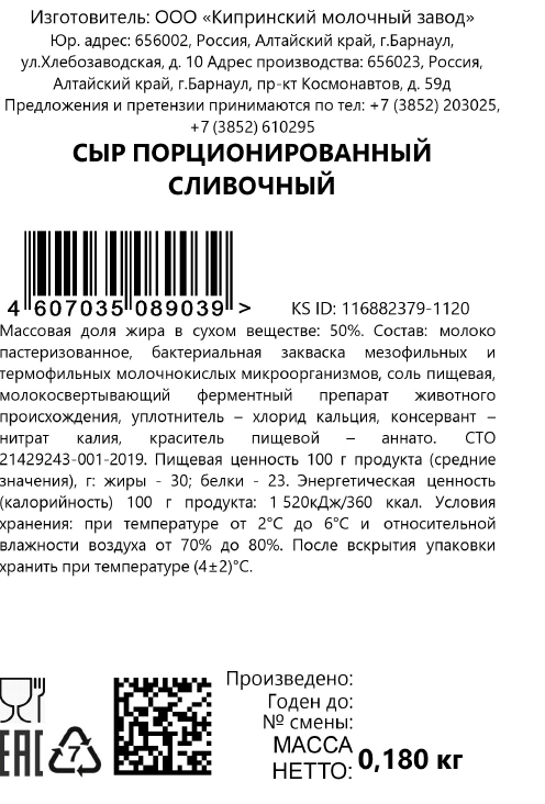 Сыр Сливочный - это продукт с совершенным сливочным вкусом и нежной ажурной текстурой. Массовая доля жира 50% обеспечивает его отличную питательную ценность и оптимальную плотность. Срок созревания составляет 30 суток. Сыр этого сорта подходит для употребления как в качестве самостоятельной закуски, так и в составе выпечки, соусов, горячего. Его присутствие облагораживает любое блюдо и придает ему изюминку. Технология производства сыра Сливочный доводилась Мастерами Киприно до идеальной в течение целого года. Выбирая его, Вы сможете насладиться отлично сбалансированным вкусом и ароматом. Полутвердый сыр с великолепным нежным сливочным вкусом, дополненным легкой кислинкой, и приятным ароматом. Приготовлен из высококачественного натурального коровьего молока. Консистенция - пластичная, с мелкими дырочками. Хорошо подходит как для приготовления бутербродов, так и для более сложных блюд.