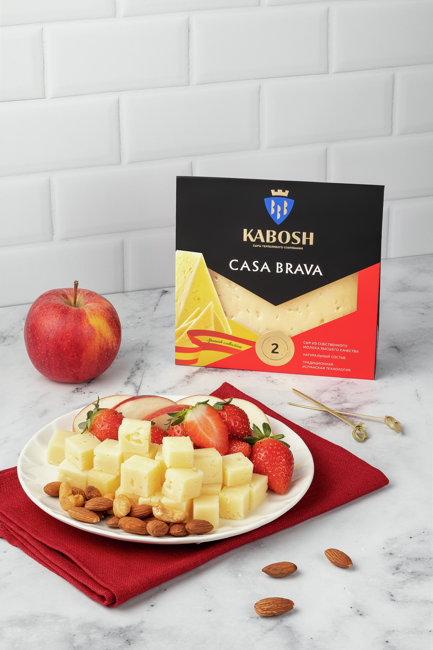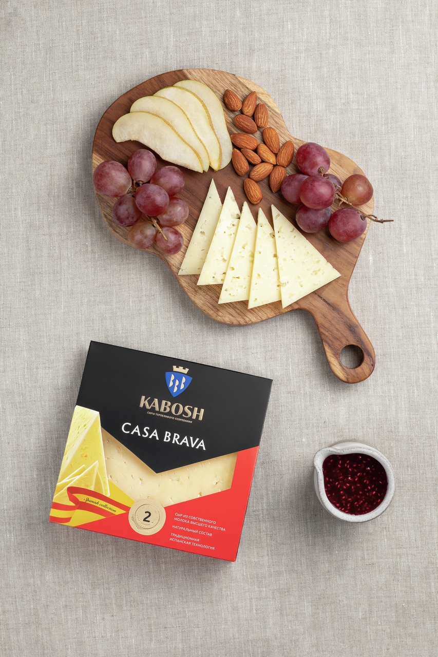 Сыр Кабош Casa Brava кусок 50%, 180 г - продукт средней выдержки с чистым ярким вкусом с нотками свежесбитого сливочного масла и поджаренного хлеба. Сыр обладает нежно-желтым цветом и средней плотностью, сливочным вкусом и ароматом. Хорошо плавится под воздействием высокой температуры. Является высококачественным продуктом отечественного производства. Производится по классической технологии. Применяется в кулинарии для приготовления бутербродов или тостов, добавления в салаты, соусы, горячие блюда. Натертым сыром можно посыпать мясо или рыбу перед запеканием, чтобы получить аппетитную золотистую корочку. Жирность составляет 50%. В составе содержится большое количество кальция, железа, фосфора и витаминов С, Е, А, группы В, которые необходимы для нормальной работы организма.