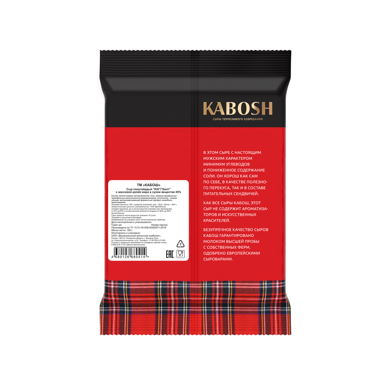 Сыр Кабош Kilt нарезка 45%, 180 г – это продукт высокого качества. Выделяется полутвердой структурой и тонким сливочным ароматом. Производится по традиционной технологии. Цвет сыра — светло-желтый. Продукт обладает пикантным ореховым ароматом. Вкус пикантный, со сливочными и ореховыми нотками. Сыр прекрасно подойдет к фруктам. Применяется в кулинарии для приготовления тостов, добавления в салаты. Натертым сыром можно посыпать мясо перед запеканием, чтобы получить аппетитную золотистую корочку. Не содержит в составе ГМО, заменителей молочного жира, консервантов, усилителей вкуса, красителей и стабилизаторов. Жирность составляет 45%. В составе содержится большое количество кальция, железа, фосфора и витаминов С, Е, А, группы В, которые необходимы для нормальной работы организма.