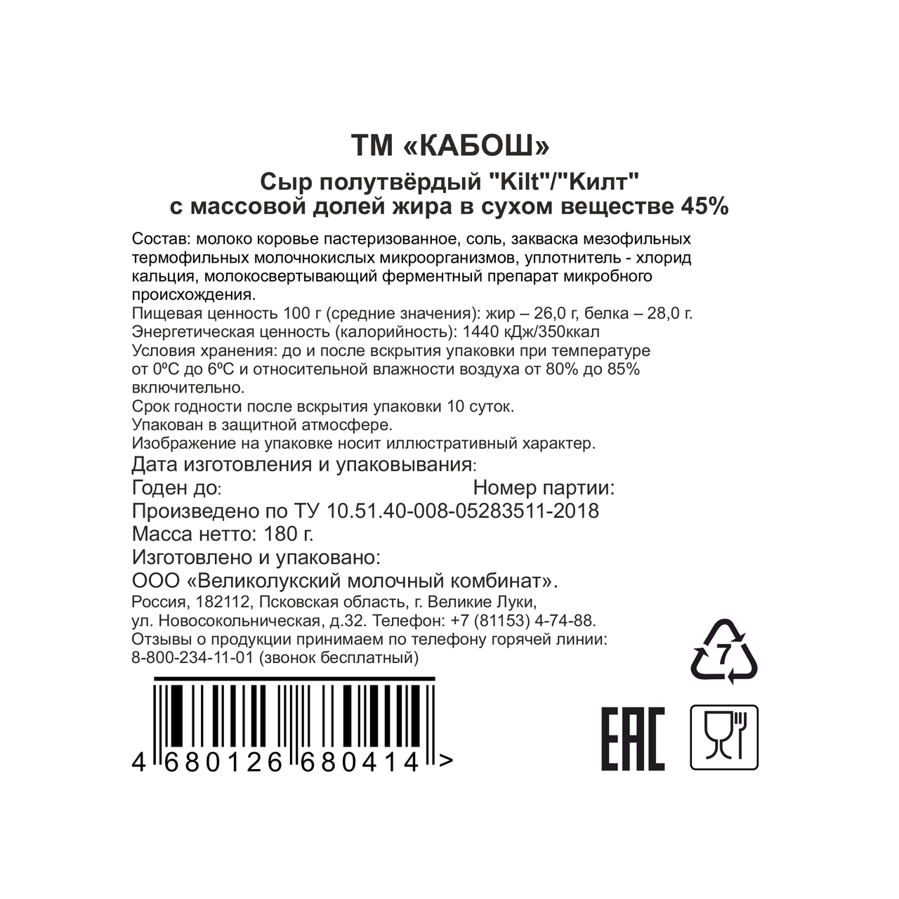 Сыр Кабош Kilt нарезка 45%, 180г
