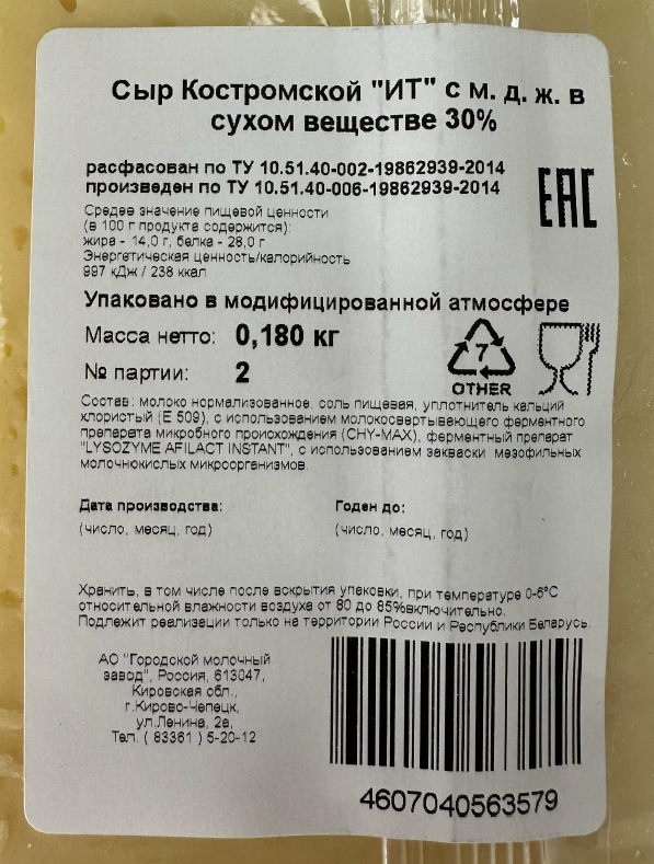 Молоко нормализированное, соль пищевая, уплотнитель - кальций хлористый (Е509), с ипользованием молокосвертывающего ферментного препарата ферментативного происхождения, ферментный препарат лизоцим, с использованием закваски мезофильных молочнокислых микроорганизмов, биоконсерванет с действующим веществом натамицин.