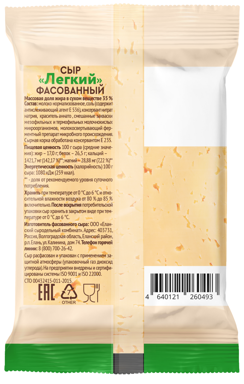 Сыр Легкий обладает полезными для организма белками, имеет пониженное содержание жира и нежный вкус. Идеальный вариант для тех, кто занимается спортом и поддерживает себя в форме. Продукт насыщает организм полезными белками, имеет пониженное содержание жира и нежный вкус. Варианты применения сыра весьма разнообразны: от приготовления салатов и канапе до горячих закусок.