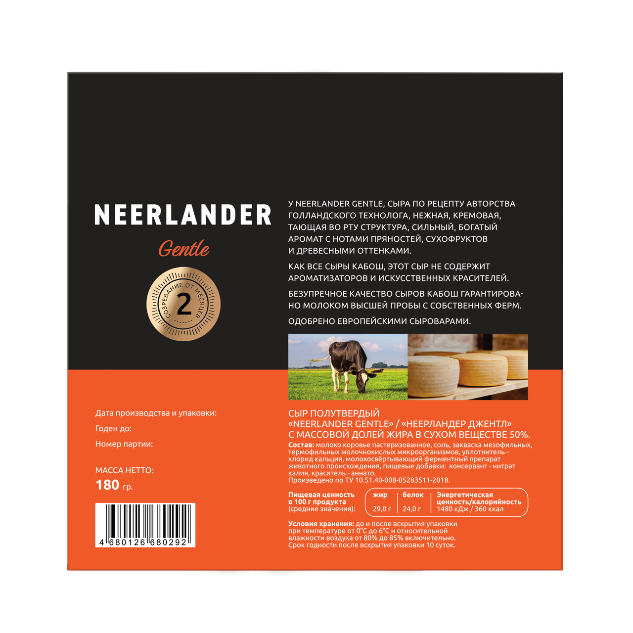 Его насыщенный, необычайно аппетитный цвет меняется в зависимости от выдержки сыра: от кремового, оттенка слоновой кости на небольших сроках созревания до тыквенно-оранжевого, темнеющего у корки среза наиболее выдержанных видов. Название сыра тоже пришло из староголландского – так называли себя жители Нидерландов в прежние времена. Для создания этого сыра мы смешиваем свежее молоко утреннего надоя с созревшим вечерним молоком – благодаря этому вкус сыра становится особенно глубоким. Неерландер отличается сильным богатым ароматом с нотами пряностей, сухофруктов, с древесными оттенками. Вкус очень насыщенный и яркий, сладковатый, пикантный, с ореховыми нюансами. Соленость умеренная, послевкусие длительное и выразительное. Консистенция сыра становится тверже с возрастом, у наиболее выдержанных вариантов она становится зернистой, ломкой. При этом сыр даже больших сроков созревания буквально тает во рту, как изысканный шоколад. Этот сыр для гурманов может выступить как изысканной закуской, так и необычным десертом