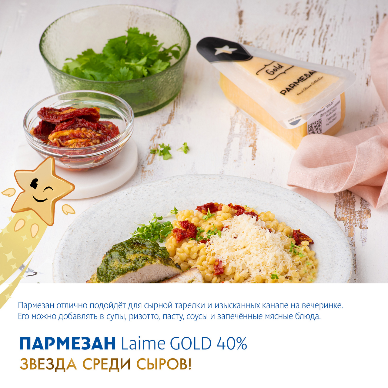 Изысканный продукт премиум-класса, обладающий благородным терпким вкусом с пикантными нотками и неповторимым ароматом. Имеет твердую плотную текстуру, крошится при нарезании. Изготовлен из отборного цельного молока. Идеально подходит для приготовления традиционных блюд итальянской кухни: пасты, пиццы, салатов и супов. Пармезан станет достойным дополнением к красным и белым винам, украсит сырную тарелку и подарит наслаждение всем ценителям по-настоящему вкусного сыра.