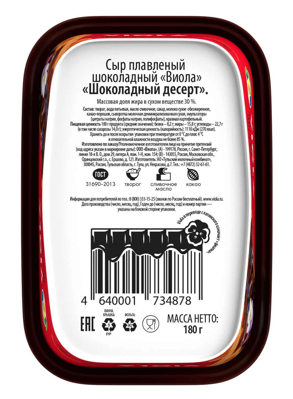 Сыр плавленый Viola Шоколадный десерт ГОСТ 30%, 180г