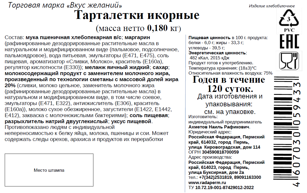Мука пшеничная хлебопекарная высший сорт; маргарин рафинированные дезодорированные растительные масла в натуральном и модифицированном виде пальмовое, подсолнечное, пальмоядровое, вода питьевая, эмульгаторы Е471, Е475, соль пищевая, ароматизатор Сливки, Молоко, краситель Е160а, регулятор кислотности Е330; меланж яичный жидкий; сахар; молокосодержащий продукт с заменителем молочного жира, произведенный по технологии сметаны с массовой долей жира 20% сливки, молоко цельное, заменитель молочного жира рафинированные дезодорированные растительные масла в натуральном и модифицированном виде, в том числе соевое, эмульгаторы Е471, Е322, антиокислитель Е306, краситель Е160а, молоко сухое обезжиренное, загустители Е1422, Е1442, Е412, закваска с молочнокислыми бактериями; соль пищевая; разрыхлитель натрий двууглекислый; уксус пищевой.