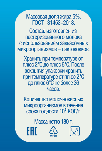 Изготовлен из пастеризованного молока с использованием заквасочных микроорганизмов - лактококков.