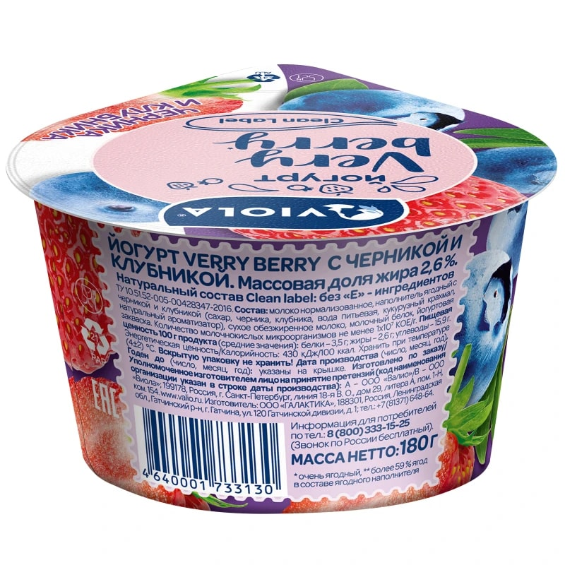 Йогурт Viola Very Berry черника-клубника 2.6%, 180г