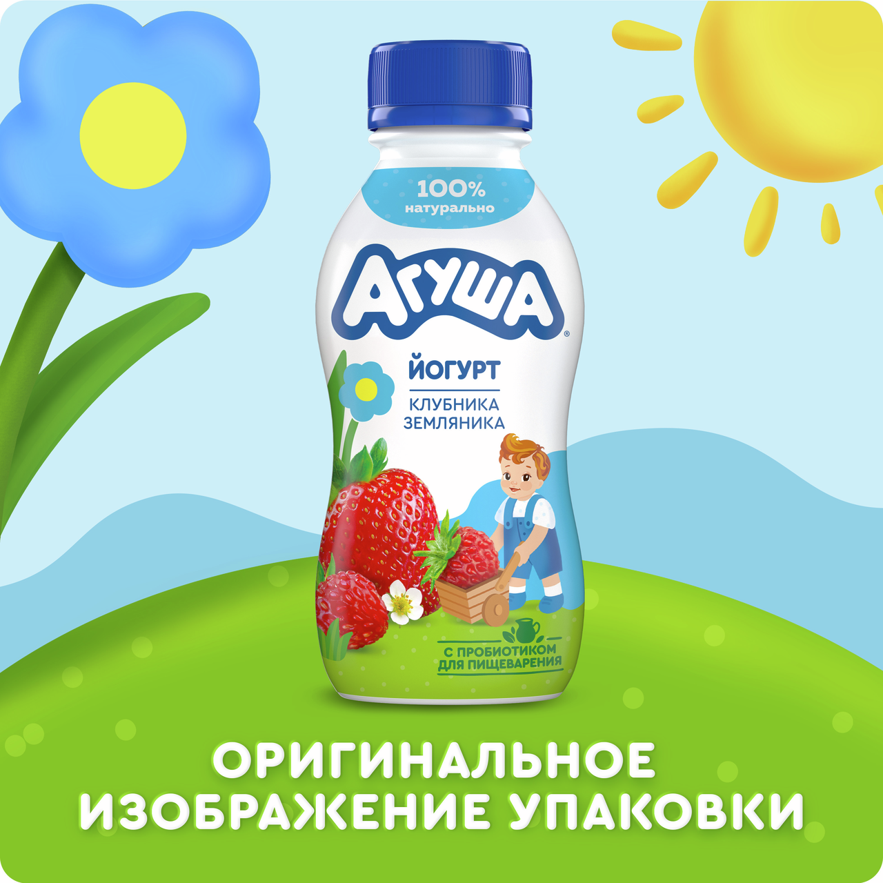 100% натуральный питьевой йогурт для детей с 3 лет Агуша Клубника-Земляника сочетает вкус ягод с пользой кисломолочного продукта. Питьевой йогурт содержит пюре из клубники и земляничный сок, пробиотические микроорганизмы для пищеварения и произведен из отборного молока без добавления консервантов и сухого молока. Детский йогурт Агуша в бутылочке 180г удобен для перекуса.