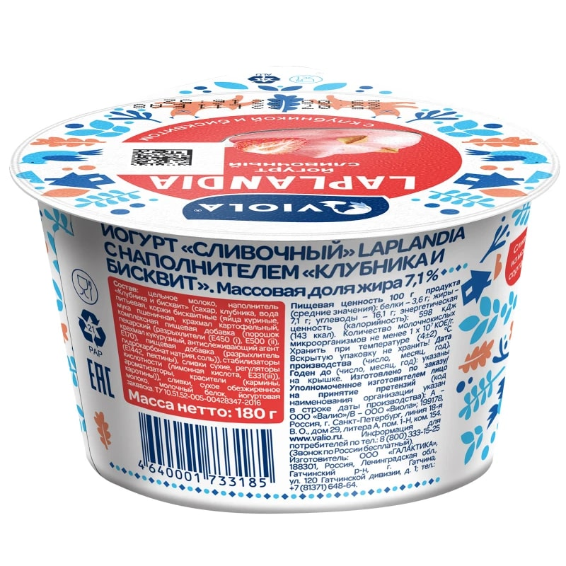 Йогурт Viola Laplandia Клубника и бисквит сливочный 7.1%, 180г