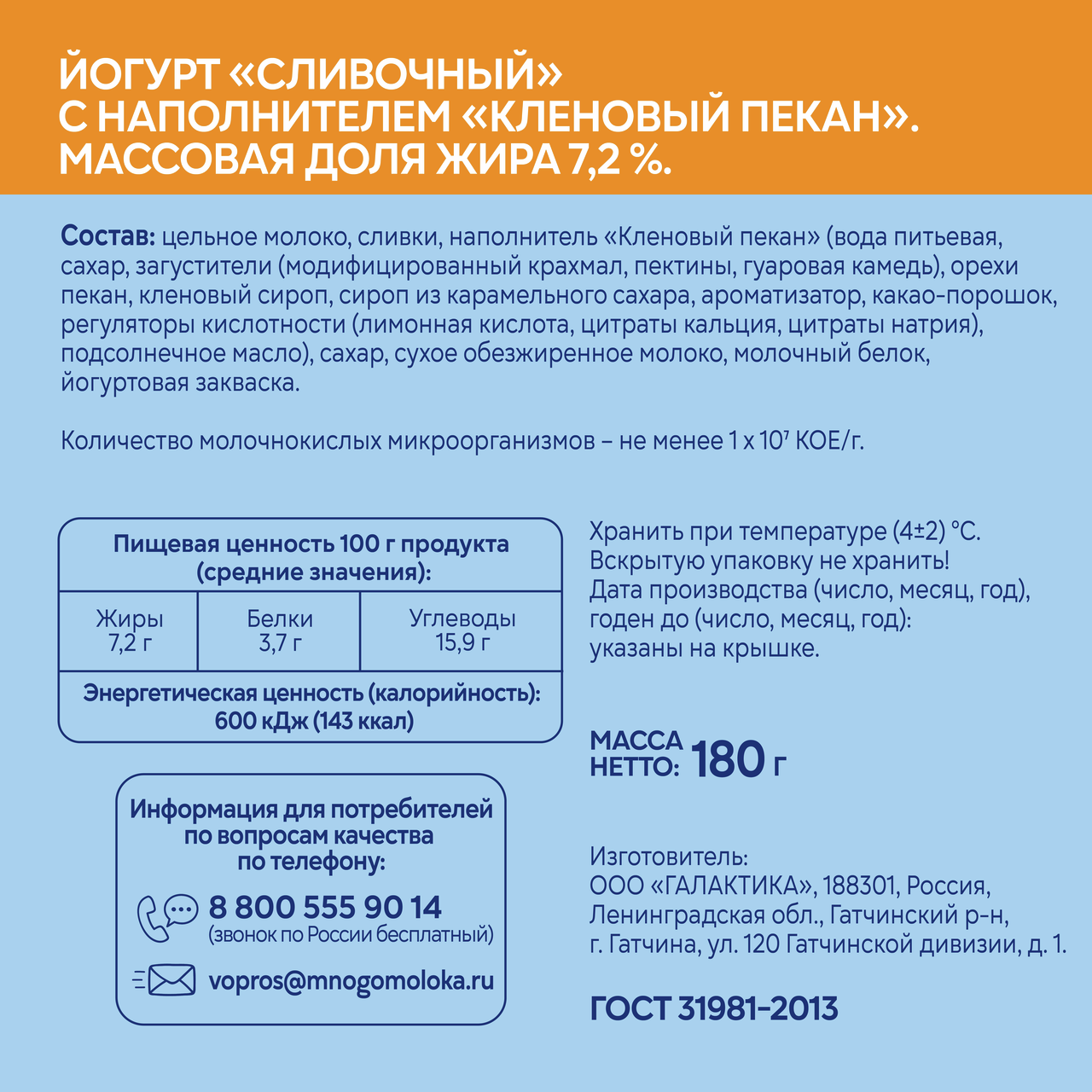 Цельное молоко, сливки, наполнитель Кленовый пекан (вода питьевая, сахар, загустители (модифицированный крахмал, пектины, гуаровая камедь), орехи пекан, кленовый сироп, сироп из карамельного сахара, ароматизатор, какао-порошок, регуляторы кислотности (лимонная кислота, цитраты кальция, цитраты натрия), подсолнечное масло), сахар, сухое обезжиренное молоко, молочный белок, йогуртовая закваска.