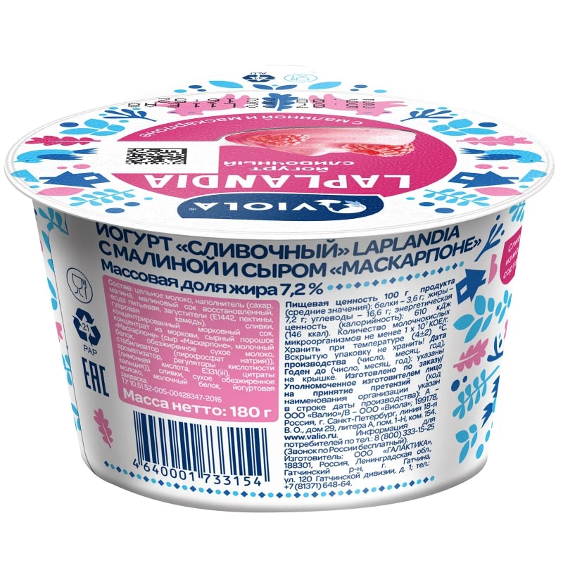 Йогурт Viola Laplandia Малина и сыр Маскарпоне сливочный 7.2%, 180г