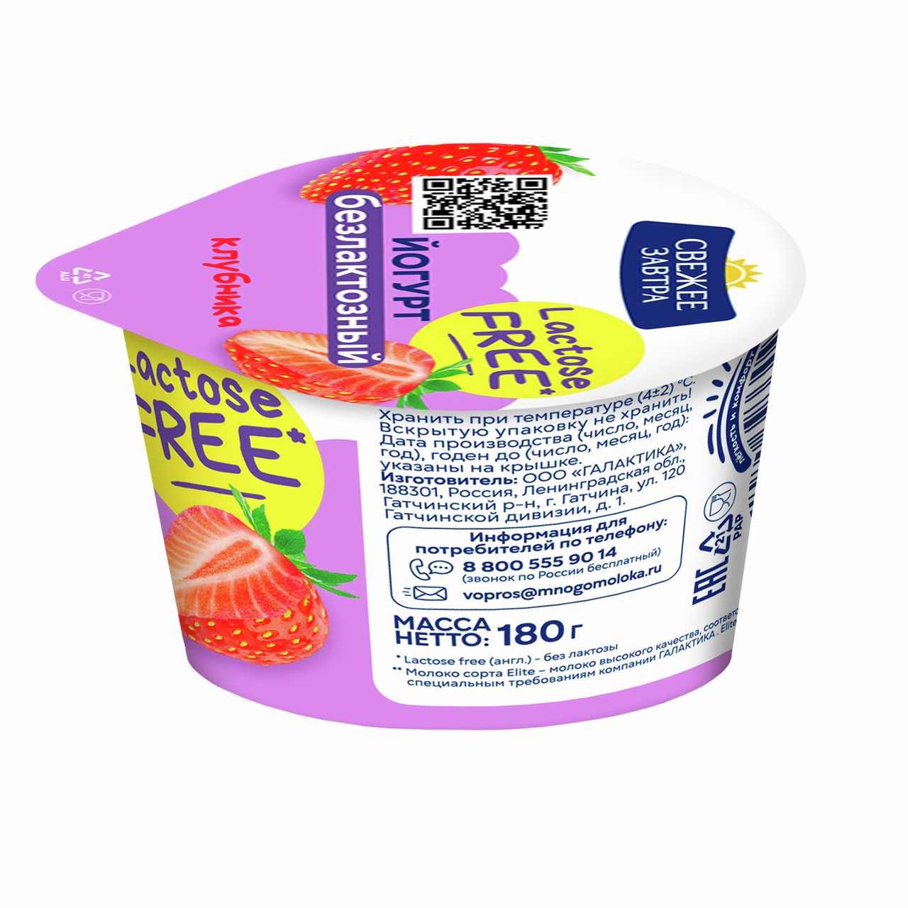 Безлактозный йогурт c клубникой Свежее Завтра производится из отборного молока самого высшего качества из сертифицированных хозяйств. В йогурте сохранена вся польза молочного белка. Мы выпускаем его в большом стаканчике, целых 180г и наш йогурт имеет насыщенный сливочный вкус. Отсутствие лактозы в йогурте не влияет на вкус и пользу продукта, но помогает людям с непереносимостью лактозы употреблять любимые молочные продукты. Способствует повышению общей сопротивляемости организма, укреплению иммунитета, восстановлению нормальной микрофлоры кишечника, улучшению обмена веществ. Идеально подойдет для перекуса, как самостоятельно, так и для заправки фруктовых салатов.