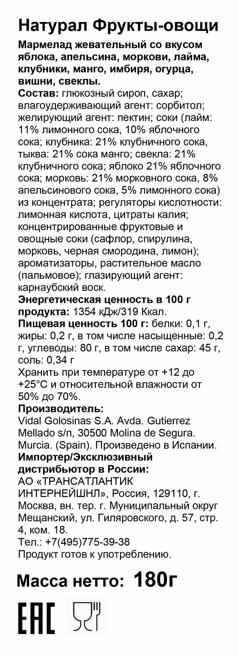 Глюкозный сироп, сахар; влагоудерживающий агент: сорбитол; желирующий агент: пектин; соки (лайм: 11% лимонного сока, 10% яблочного сока; клубника: 21% клубничного сока, тыква: 21% сока манго; свекла: 21% клубничного сока; яблоко 21% яблочного сока; морковь: 21% морковного сока, 8% апельсинового сока, 5% лимонного сока) из концентрата; регуляторы кислотности: лимонная кислота, цитраты калия; концентрированные фруктовые и овощные соки (сафлор, спирулина, морковь, черная смородина, лимон); ароматизаторы, растительное масло (пальмовое); глазирующий агент: карнаубский воск.