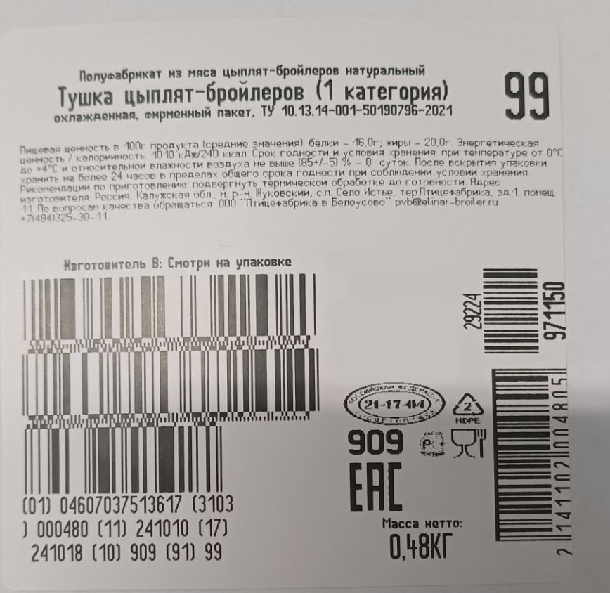 Тушка цыпленка-бройлера Птицефабрика в Белоусово охлажденная, ~1.85кг