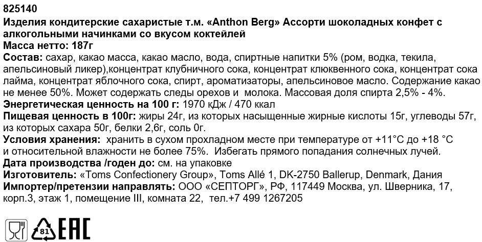 Сахар, какао масса, какао масло, вода, спиртные напитки (виски, коньяк, водка, апельсиновый ликер, ром), спирт.