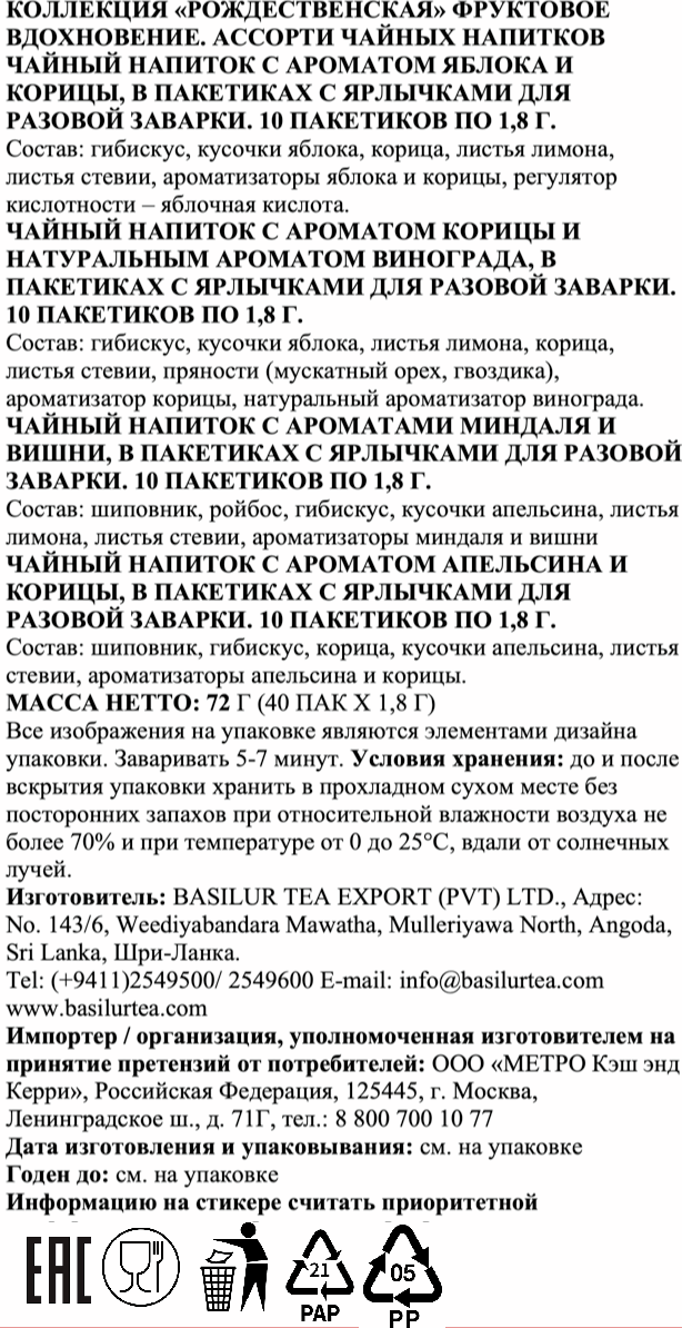 Коллекция чайных напитков Basilur Рождественская Фруктовое Вдохновение Ассорти - это изысканная коллекция чайных напитков в пакетиках, которая подарит вам незабываемые моменты наслаждения и релаксации в зимние дни. Такие вкусы, как яблоко, виноград, корица, апельсин, миндаль - это настоящий праздник вкуса и аромата. Basilur Ассорти - это идеальный выбор для тех, кто ценит разнообразие и качество. Насладитесь каждым глотком и позвольте себе окунуться в мир изысканных вкусов и ароматов. Идеален для подарка на Новый Год и Рождество.